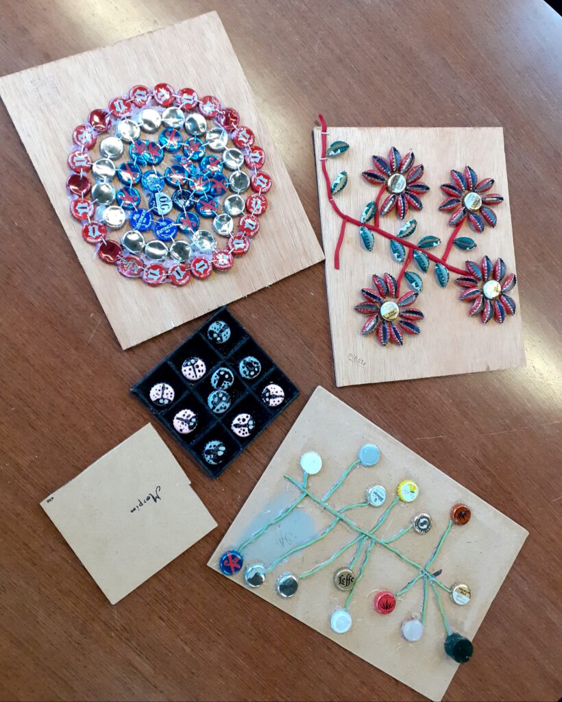 Durant le premier trimestre, les apprentis créateurs ont donné une nouvelle vie aux capsules de bouteilles. Après les avoir collectées et triées, ils les ont transformées en compositions originales : tableaux colorés, décorations murales et même jeux comme « le morpion ». Une manière ludique et concrète de découvrir que le déchet peut devenir matériau artistique à part entière.