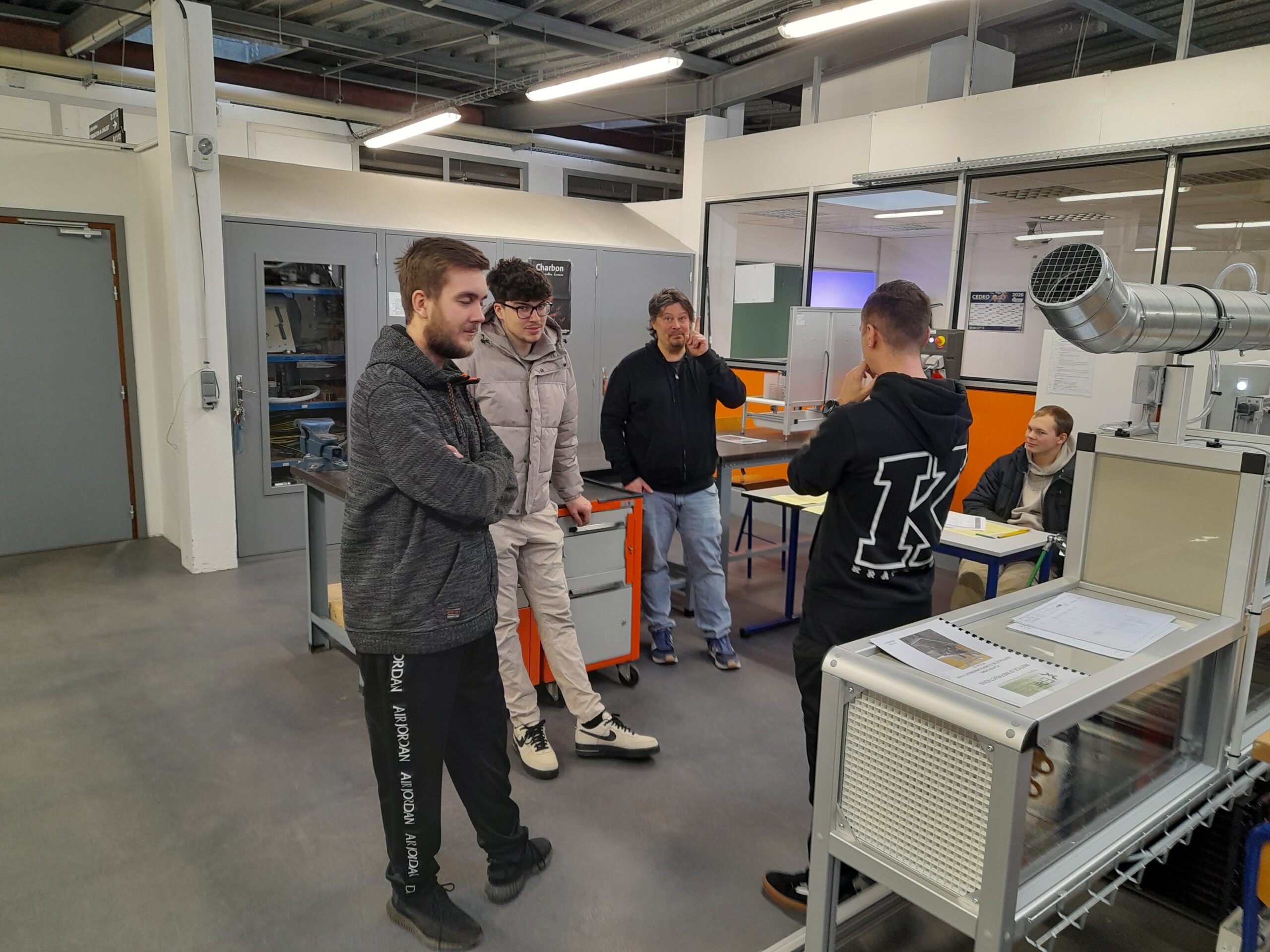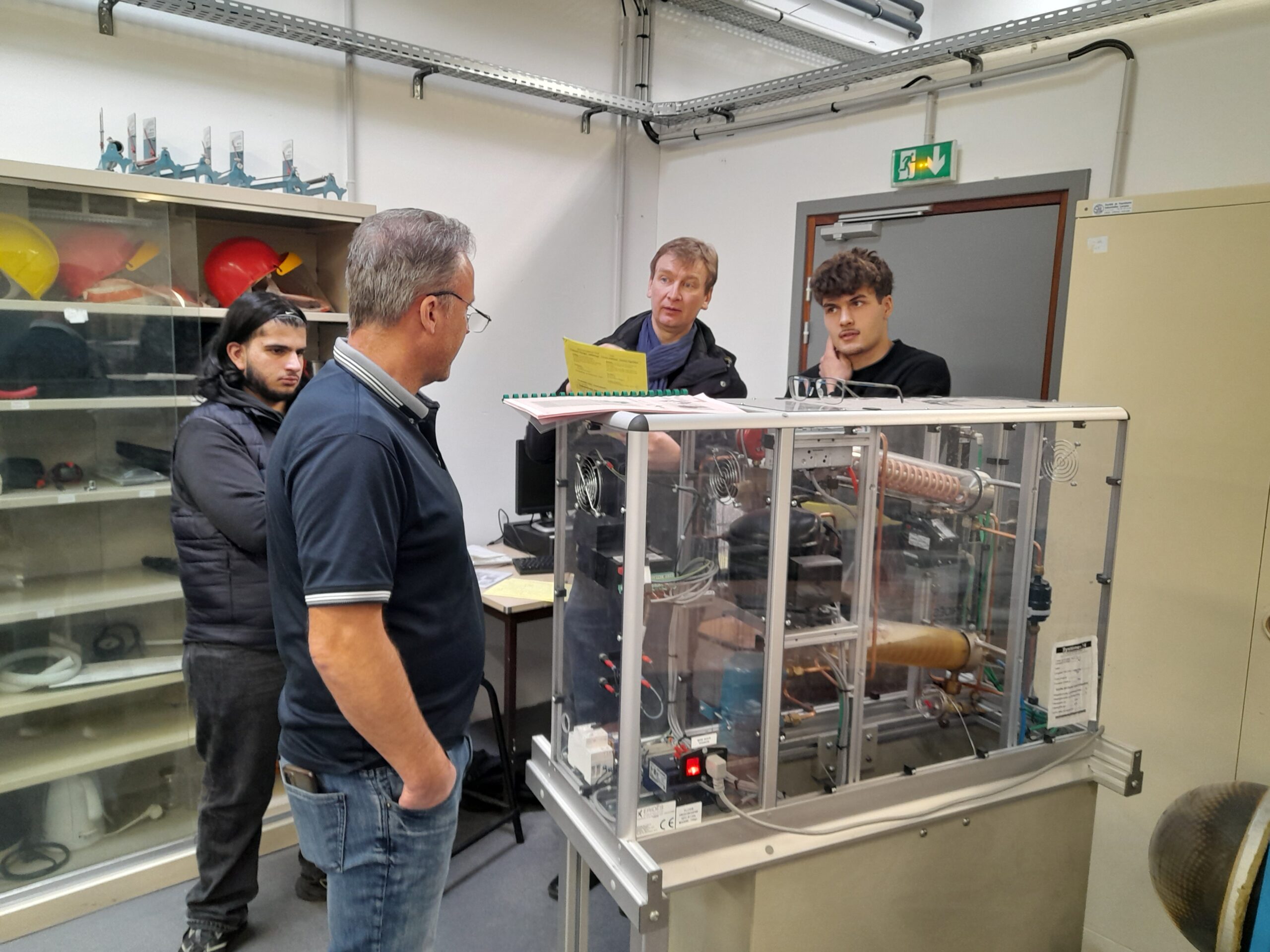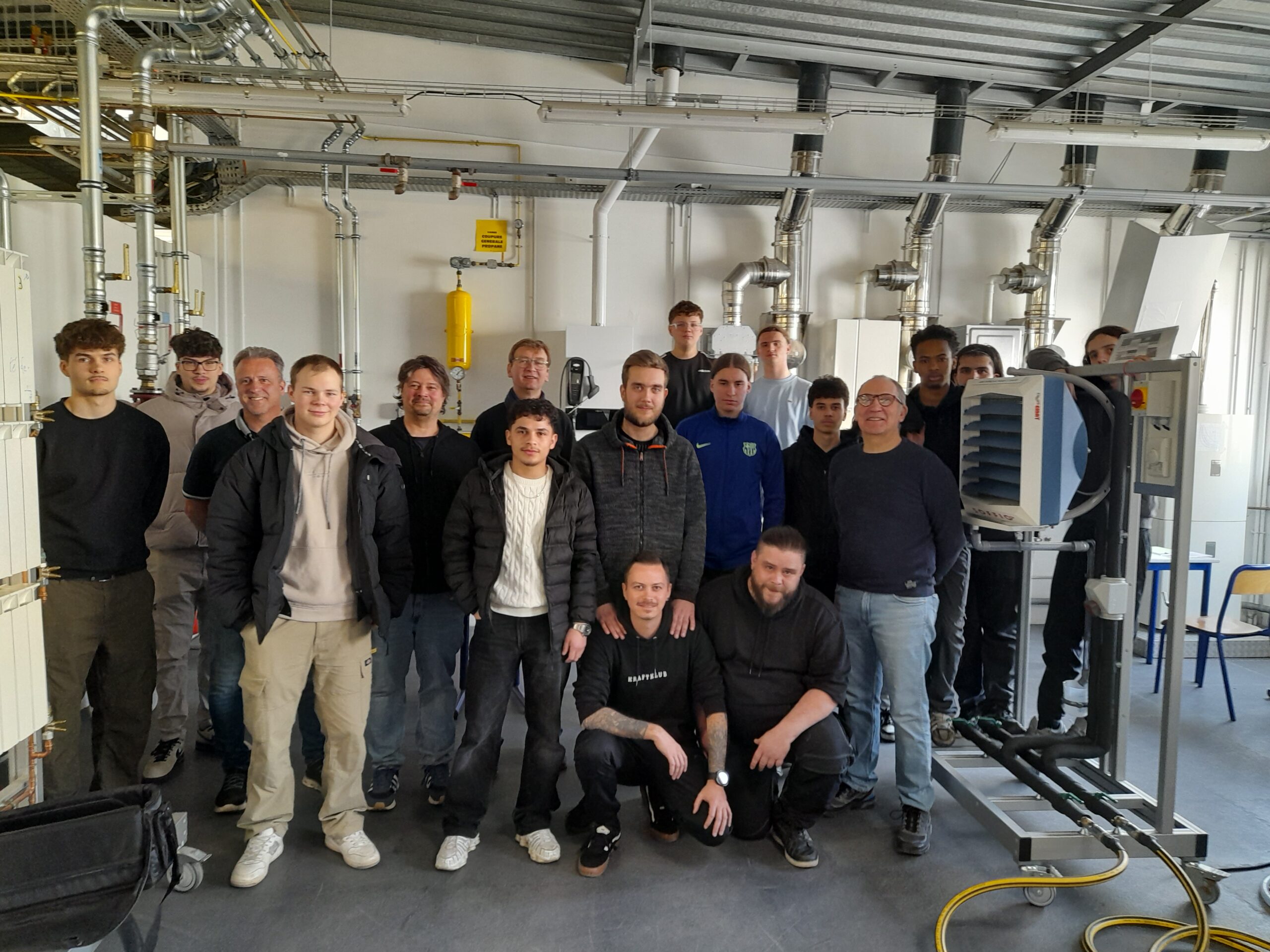 La matinée s’est déroulée dans les ateliers du lycée, où les élèves de première euro ont travaillé en binômes ou trinômes avec leurs homologues allemands. Les travaux pratiques, préparés par MM. Meyer Daniel et Wagner Christophe, portaient sur une centrale de conditionnement d’air, des pompes à chaleur air-eau et eau-eau, la mise en service de chaudières ainsi que l’étude d’un schéma frigorifique.