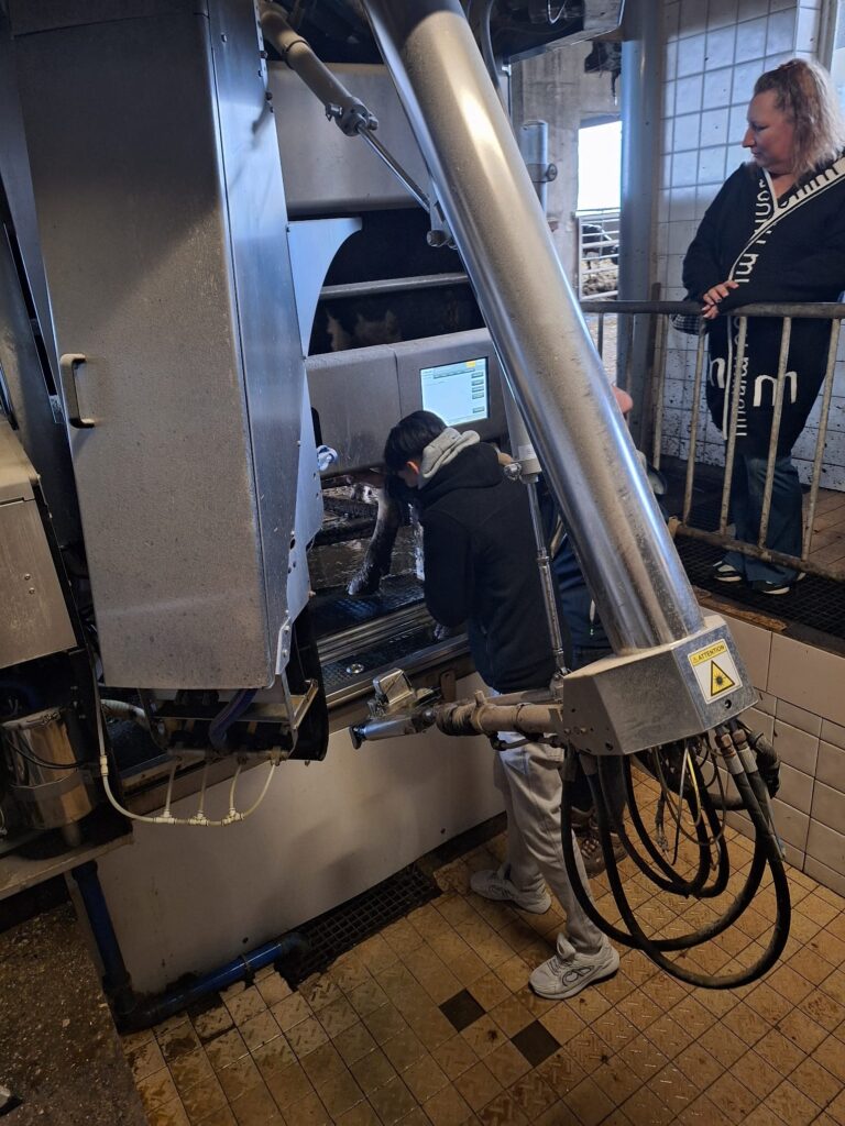 L’exploitation, engagée dans l’agriculture biologique, a offert aux élèves une vision concrète du monde agricole à travers divers ateliers de découverte. Les participants ont pu découvrir un élevage de vaches à viande et laitieres, découvrir les techniques de traite automatisée et manuelle ainsique l’étable aménagéepourle bien-être animal. Cette visite a également permis d’aborder les thématiques de la biodiversité et de la production locale. En effet les élèves ont pu appréhender les enjeux d’un élevage autonome : la ferme produit l’essentiel des besoins de ses animaux. Les participants ont pu profiter d’un goûter fait de produits de la ferme : chocolat chaud et fromage.